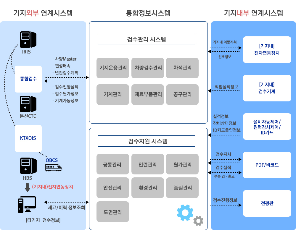 검수정보시스템은 모든 철도차량의 원활한 운행을 지원하기 위해 무선 네트워크 기술, 모바일 컴퓨팅 기술, 바코드처리기술 전광판 활용기술 등 최첨단 기술요소를 이용하여 철도차량의 유지보수를 담당하는 철도차량기지운용과 검수업무 및 제반 일반관리 업무 등을 체계적이고 효율적으로 수행할 수 있도록 지원하는 시스템입니다.